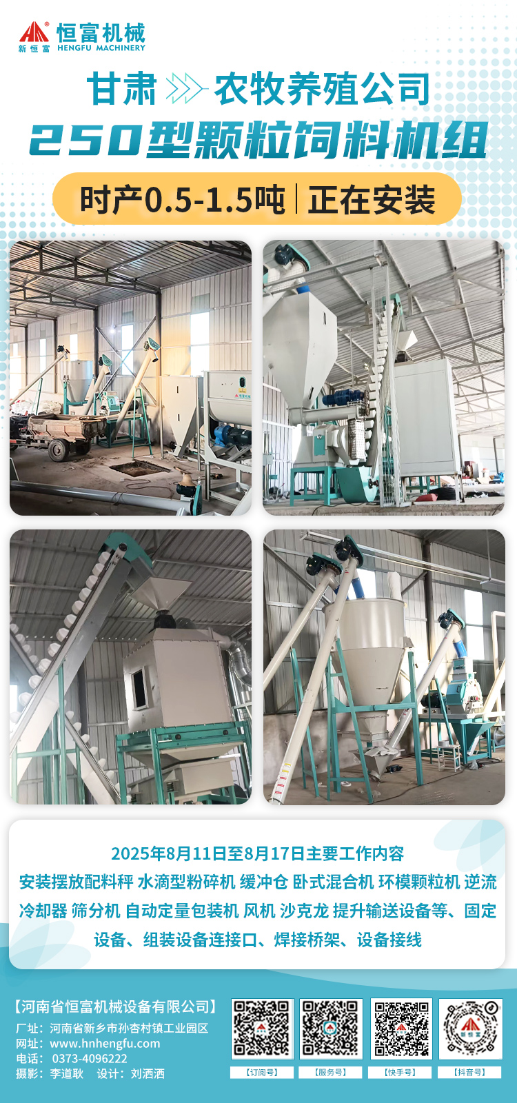 甘肃 | 250型颗粒饲料机组 机组简介: 甘肃农牧养殖公司的 250 型环模颗粒饲料生产线正在安装,可生产时产 0.5-1.5 吨的颗粒饲料和时产 3 吨的粉状饲料,饲料除自用外主要加工出售。 该生产线包含水滴式饲料粉碎机、单轴双螺旋混合机、环模饲料颗粒机、逆流饲料冷却器、振动分级筛、配料秤、饲料自动定量打包机及 PLC 电控系统等设备。 本套设备覆盖粉碎、混合、制粒、冷却、分级、配料、打包及电控全流程,可高效生产颗粒与粉状饲料;适用于有自用及出售需求、需同时生产颗粒和粉状饲料的农牧养殖企业,尤其适合要求流程规范化、自动化的中小型养殖及饲料加工场所。 2025年8月9日-8月17日主要工作内容有:组装设备;摆设备,订皮带,挖地坑,整理畚斗提升机;上畚斗,粉地坑,装风网管道,固定设备、组口;焊接桥架,跑线;接线。 工艺流程: