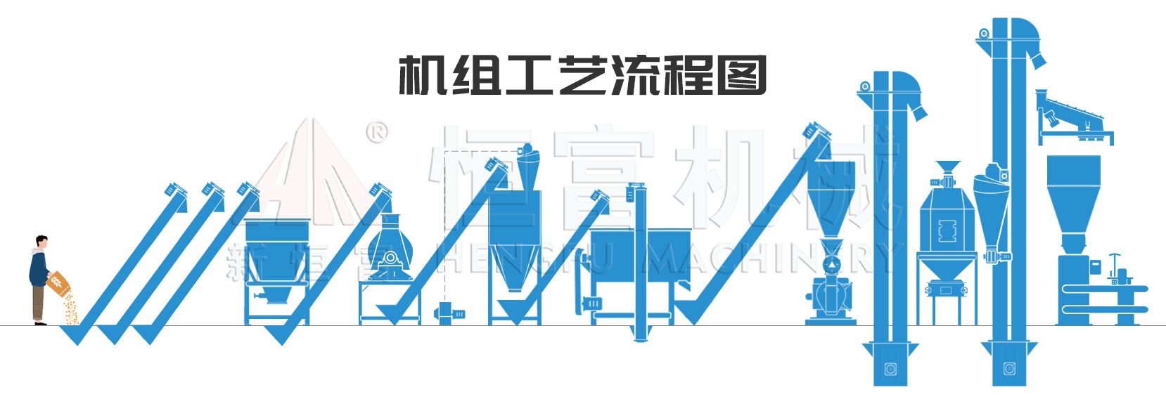 本套设备包含:饲料配料秤、环模饲料颗粒机、辊式饲料破碎机、逆流式饲料冷却器以及饲料自动定量打包机。
