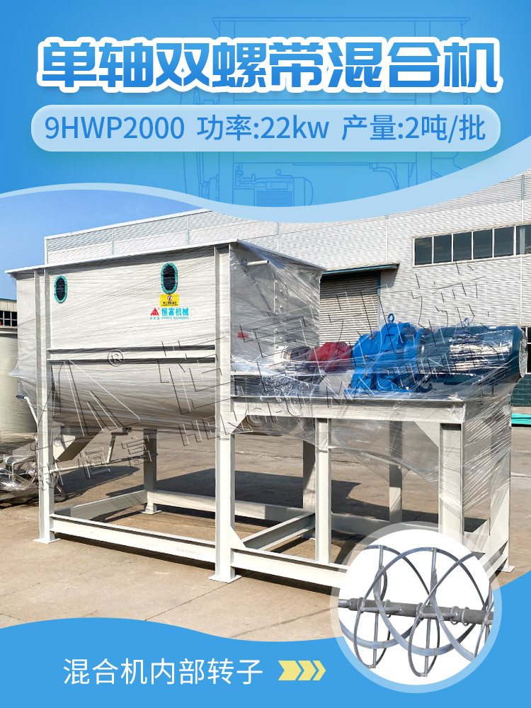 2吨单轴螺带混合机:带加热油脂添加系统,可实现液态营养(如油脂)的加热、恒温喷洒,混合更均匀,饲料适口性更佳。